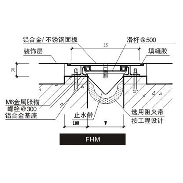 承重型地坪变形缝——增加盖板厚度,提高承载能力,采用滑杆确保变形缝装置变位时仍能保持中心及原有位置。