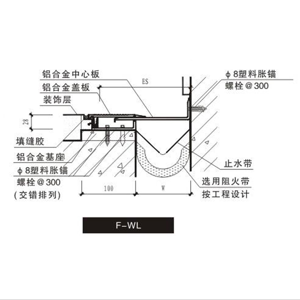金属卡锁型地坪变形缝——由一块自由移动的中心板来实现变形,中心板压紧在两侧铝合金基架之间,在建筑物发生伸缩变形时能保持其水平状态。产品表面加工成锯齿形,防滑。可铺设薄型材料。